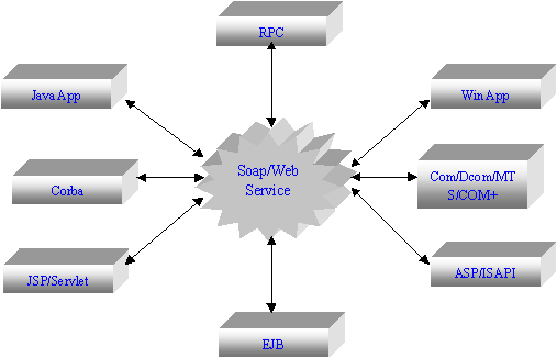 图 1-8 Soap 允许各种组件模型和实现技术集成在一起