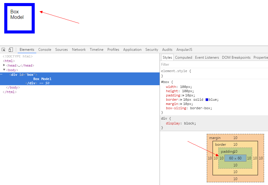 border-box: padding和border被包含在定义的width和height之内。对象的实际宽度就等于设置的width值,即使定义有border和padding也不会改变对象的实际宽度,即 ( Element width = width ) 此属性表现为怪异模式下的盒模型。