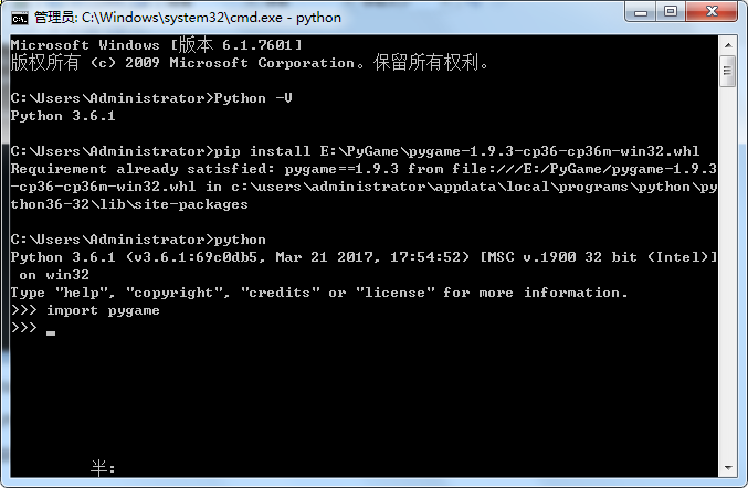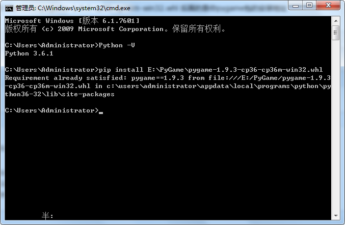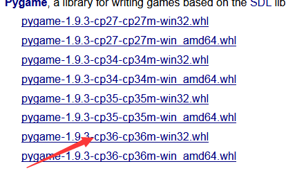 这里我们需要选择电脑位数所对应的.whl文件,刚才我们下载的是3.6.1版本的Python,这里对应的pygame应该是
