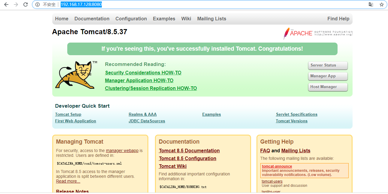 4、在本地的web管理界面验证输入Linux系统的ip加端口号 如:http://192.168.17.128:8080/,出现如下页面即安装成功了,