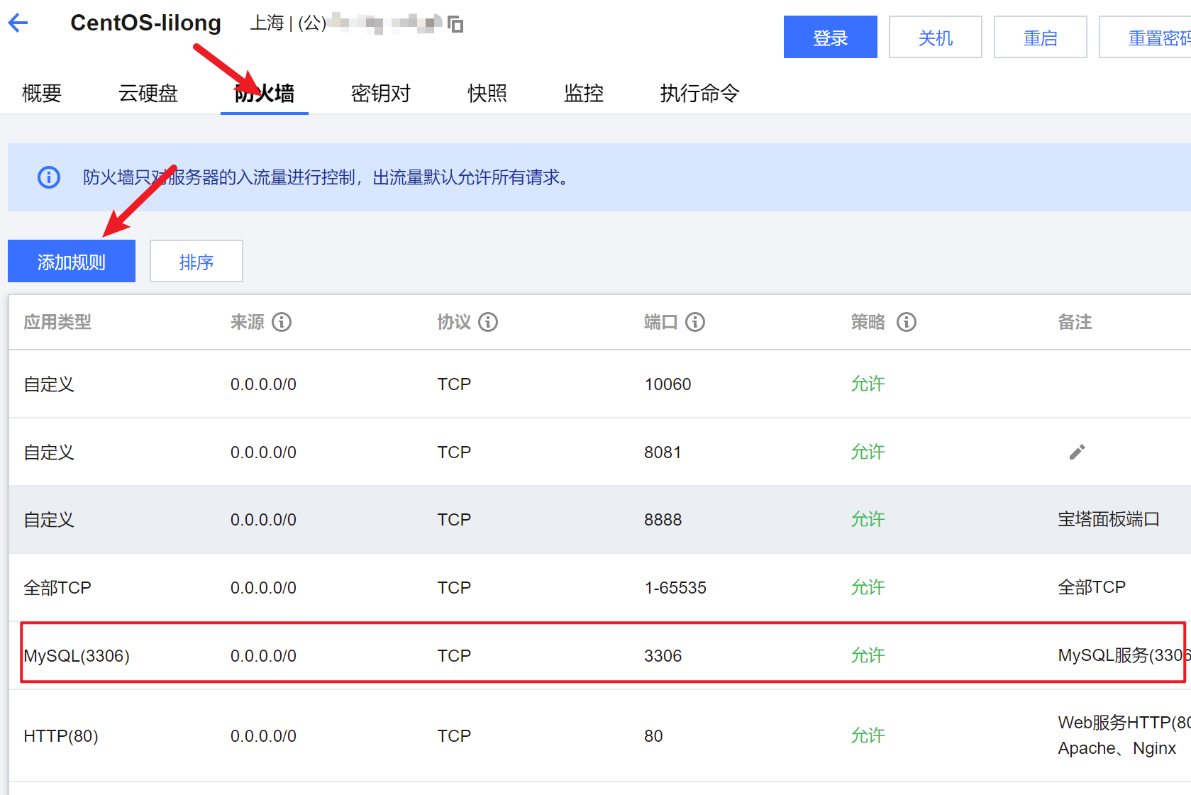 注意:开启远程连接之后,以腾讯云为例:需要添加服务器安全组规则,也就是开启端口访问,如mysql数据库访问端口为:3306 这里需要开启3306端口,如下图所示: