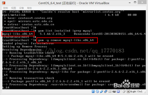 yum -y remove mysql-libs.x86_64,若有多个依赖文件则依次卸载。