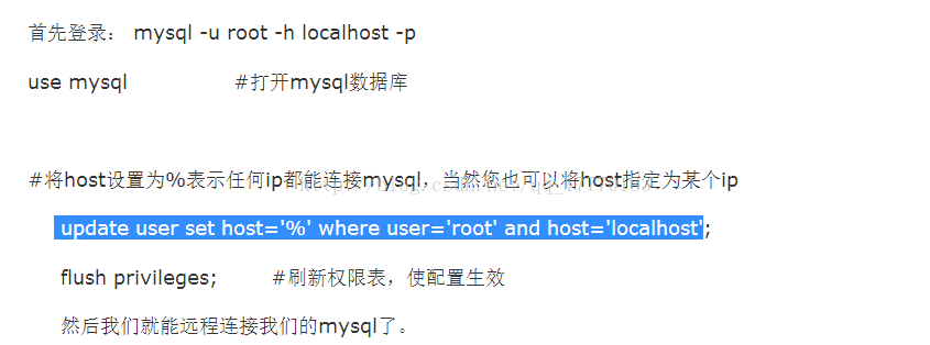 将host设置为%表示任何ip都能连接mysql,当然您也可以将host指定为某个ip