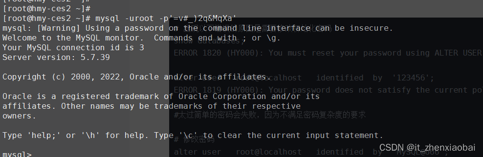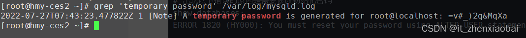 - 将创建一个超级用户 帐户’root’@‘localhost’。并会设置超级用户的密码,将其存储在错误日志文件/var/log/mysqld.log中。