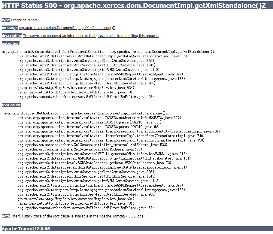 org.apache.axis2.dataretrieval.DataRetrievalException: org.apache.xerces.dom.DocumentImpl.getXmlStandalone()Z org.apache.axis2.dataretrieval.AxisDataLocatorImpl.getData(AxisDataLocatorImpl.java:85) org.apache.axis2.description.AxisService.getData(AxisService.java:2964) org.apache.axis2.description.AxisService.getWSDL(AxisService.java:1645) org.apache.axis2.description.AxisService.printWSDL(AxisService.java:1413) org.apache.axis2.transport.http.ListingAgent.handleWSDLRequest(ListingAgent.java:327) org.apache.axis2.transport.http.ListingAgent.processListService(ListingAgent.java:183) org.apache.axis2.transport.http.AxisServlet.doGet(AxisServlet.java:260) javax.servlet.http.HttpServlet.service(HttpServlet.java:624) javax.servlet.http.HttpServlet.service(HttpServlet.java:731) org.apache.tomcat.websocket.server.WsFilter.doFilter(WsFilter.java:52)