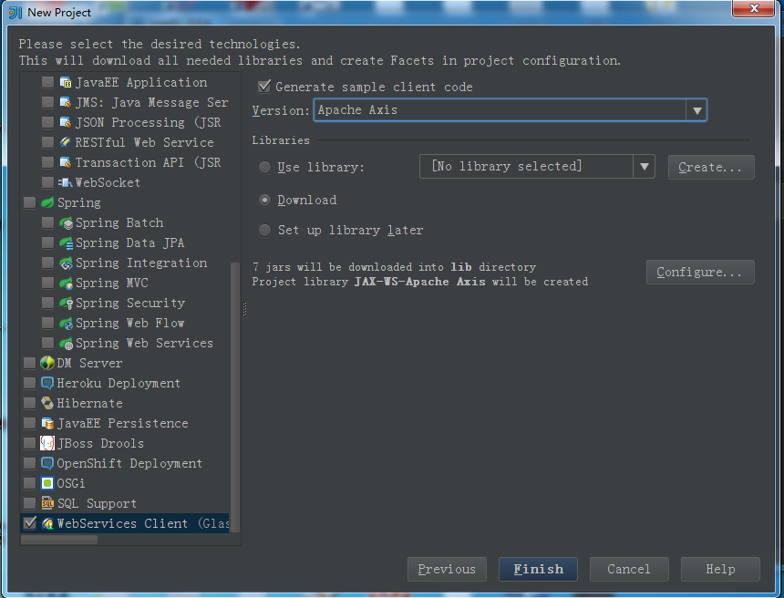 然后选择工程种类的最后一种: WebServices Client ,然后在右边的 Version 中选择 Apache Axis ,然后点 Finish。