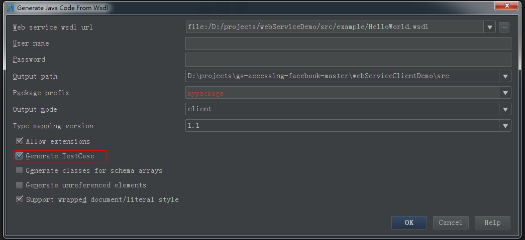 IDE 会根据 wsdl 文件自动产生 Java 代码,首先我们得告诉 IDE wsdl 文件的地址。我们选择在上一个教程中创建的那个 web service 服务端的 wsdl 文件,然后点 OK 。