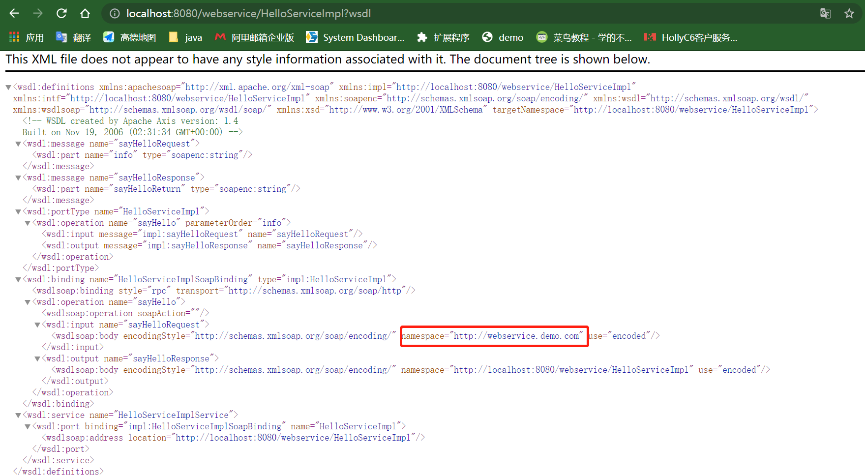 启动服务,在浏览器中键入:http://localhost:8080/webservice/HelloServiceImpl?wsdl