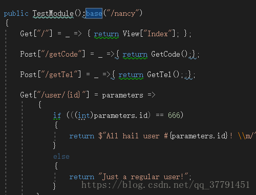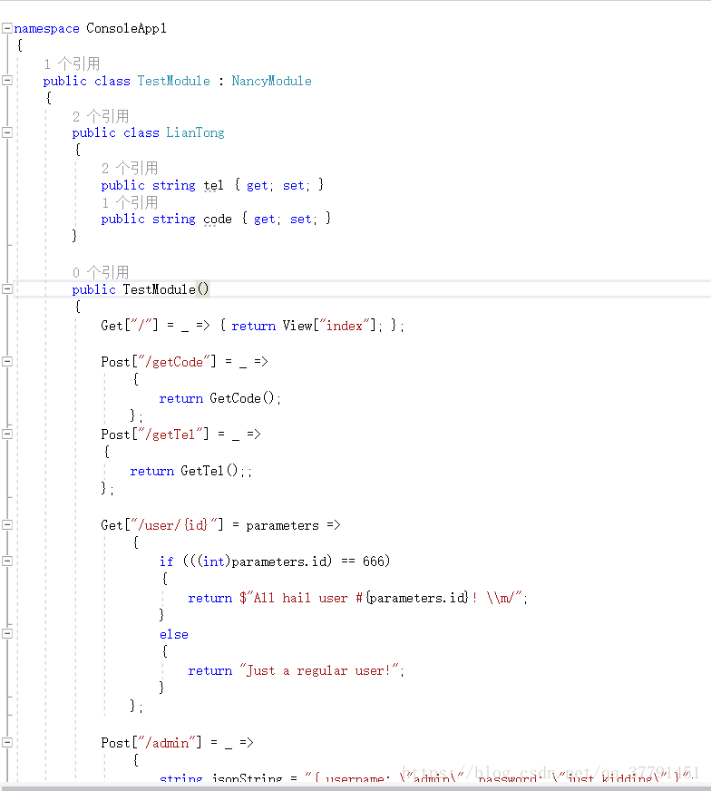 代码太长就不都贴出来了,上面代码中每一个Get["/"]或Post["/"]中的["/"]都是一个路由,Nancy的路由非常灵活你可以根据路由规则随意定制,Get["/"]是默认路由,只需要在浏览器地址栏里输入localhost:50223就可以访问了,而Get["/user"]代表在浏览器输入的网址为localhost:50223/user 才可以访问,否则就会报错404。每一个Get或Post都代表这个Module可以处理的请求路由格式,每一个每一个Get或Post就是一个请求,其中第一和第二个Post代表处理TestModule类的两个方法,所以必须要返回方法名,注意后面同路径的Get或Post后覆盖前面写的,Get["/"]=a=>{return "a;"};会被后面写的Get["/"]=b=>{return "b";}; 覆盖,网页只会显示b