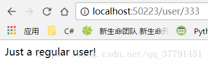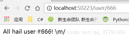 同时处理路由请求也是有一定逻辑的,我们一第二个Get为例:Get["/user/{id}"]=parameters=>{...}; 中定义了一个id参数 下面写了一个判断语句,判断id是否为666,是输出All hail user 和我们输入的id! \m/ 我们在浏览器输入localhost:50223/user/666