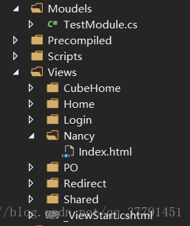 然后你只需直接在项目下直接新建Modules文件夹,Models和Views文件夹是和MVC共用的,同样也会自动寻找Views的视图文件 在浏览器地址栏输入localhost:端口/nancy就可以了 但是写XxxMoudle.cs文件的时候要继承base("/nancy")