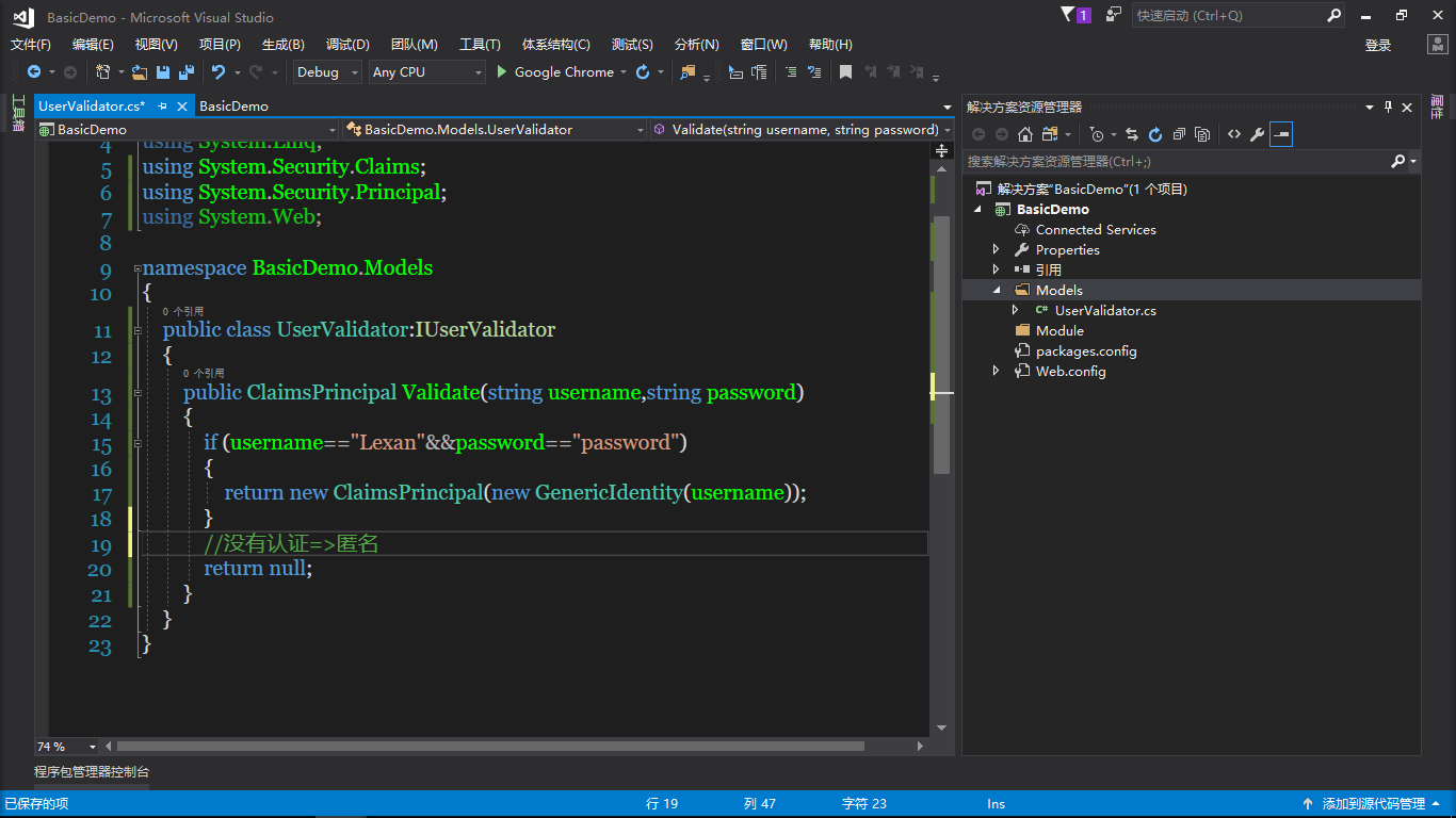 public ClaimsPrincipal Validate(string username,string password) { if (username=="Lexan"&&password=="password") { return new ClaimsPrincipal(new GenericIdentity(username)); } //没有认证=>匿名 return null; }