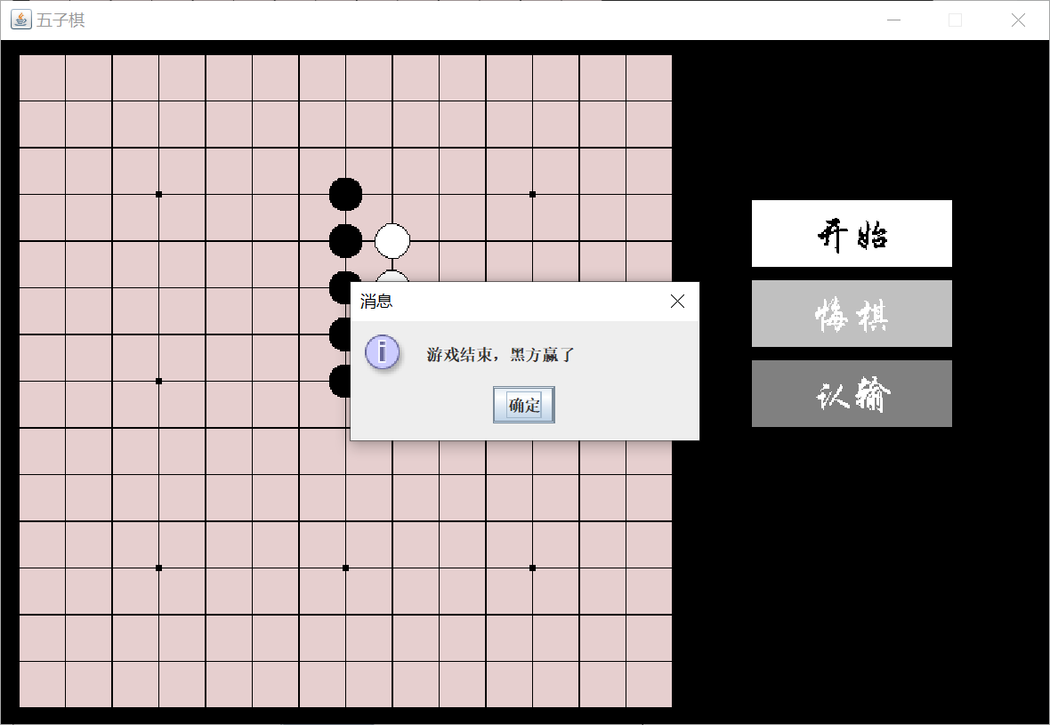 JOptionPane.showMessageDialog(this, "游戏结束," + (SaveGame[x][y] == 1 ? "黑方赢了" : "白方赢了"));//弹出提示对话框