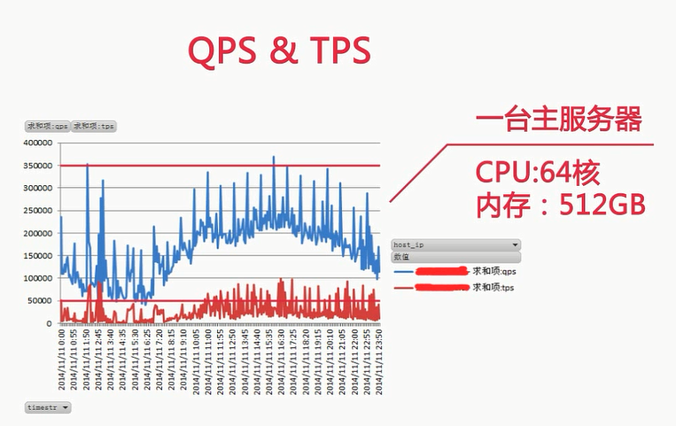 这个主服务器的性能还相当不错的,当时还是比较好的服务器硬件了,大概是64核CPU,512G的内存,所以QPS和TPS的数量