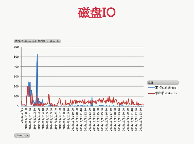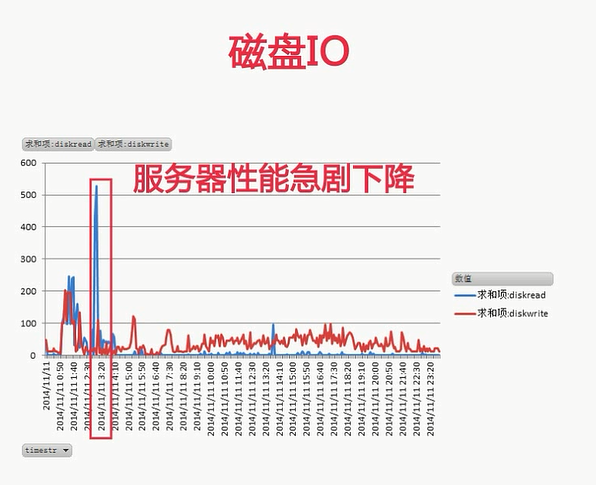 接下来咱们来看看磁盘IO的数据,这张图就是当时的读写,大家看到这个磁盘读写是相当高的,这里还要说明的一点就是,