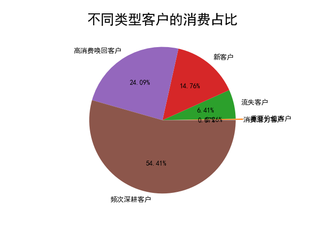 plt.title('不同类型客户的消费占比',fontsize=20)