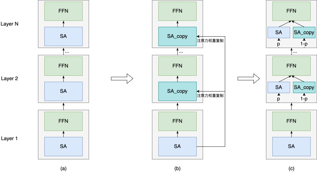 解决方案:我们发现Attention Weights在不同层之间的差异性不大。一个直接的想法是只在第一层计算Attention Weights,在其它层复用这些值,那么整个模型Attention Weights的计算复杂度降低为原来的1/N,如下图(b)所示。但是,通过实验发现,这种方法对效果是有损失的。因此我们对模型做了进一步改进,在每一层我们随机掷骰子,有p的概率重新计算Attention Weights,1-p的概率复用上一层的Attention Weights。通过实验发现,当p设置为50%,模型效果无损,Attention Weights总的时间复杂度降低50%。