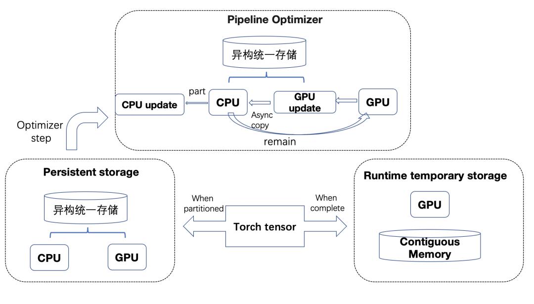 训练框架:随着预训练模型的参数不断增大,模型训练需要的存储空间显著增加,如万亿模型仅模型状态需要17000多G显存,仅仅依靠显存严重束缚着模型参数的扩大,为了降低显存的压力同时扩大模型参数,基于Zero-Infinity的理念我们开发了太极AngelPTM,其同Zero-Infinity一样在所有GPU之间partition模型的参数、梯度、优化器状态,并把参数、梯度、优化器状态offload到CPU内存,为了最优化的利用内存和显存进行模型状态的Cache,太极AngelPTM引入了显存内存统一存储视角,同时太极AngelPTM将多流异步化做到了极致,在充分利用CPU和GPU进行计算的同时最大化的利用带宽进行数据传输和NCCL通信,使用异构流水线均衡设备间的负载,最大化提升整个系统的吞吐。在太极机器学习平台1T内存+单卡40G显存硬件环境下(由于SSD会以5倍多的速度拖慢训练,万亿模型并未考虑使用SSD作为三级存储),Zero-Infinity单机最大可容纳30B模型,需要至少320张卡训练万亿模型,太极AngelPTM单机最大可容纳55B模型,需要192张卡就可以训练万亿模型。相比Zero-Infinity,太极AngelPTM训练速度有2倍提升,节省40%训练资源。