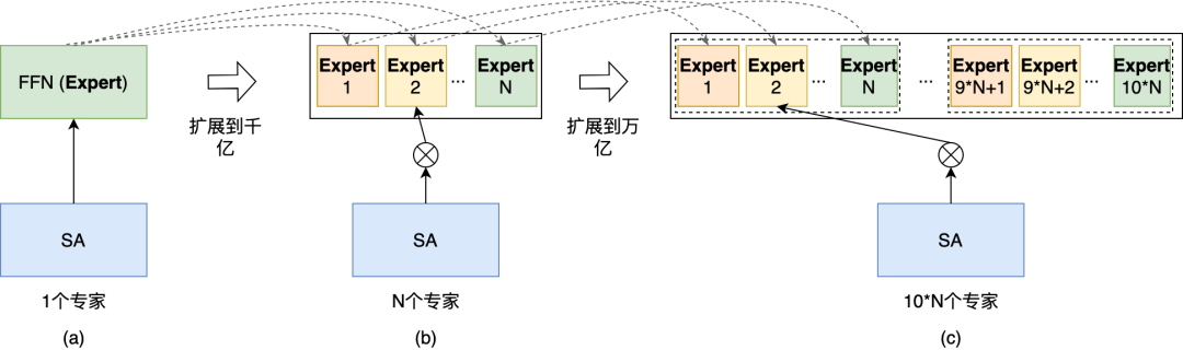 解决方案:热启动+模型规模课程学习的策略,我们借鉴了课程学习的思想,首先在小规模的模型上训练收敛,然后将小模型的知识迁移到大模型,逐步增加模型的规模。具体来说,如下图(a)所示,我们先训练只有一个专家的Dense模型,然后,如图下(b)通过扩展专家数量把模型规模提升到千亿规模并训练收敛,最后继续通过增加专家数量把模型规模提升到万亿直至收敛如下图(c)。
