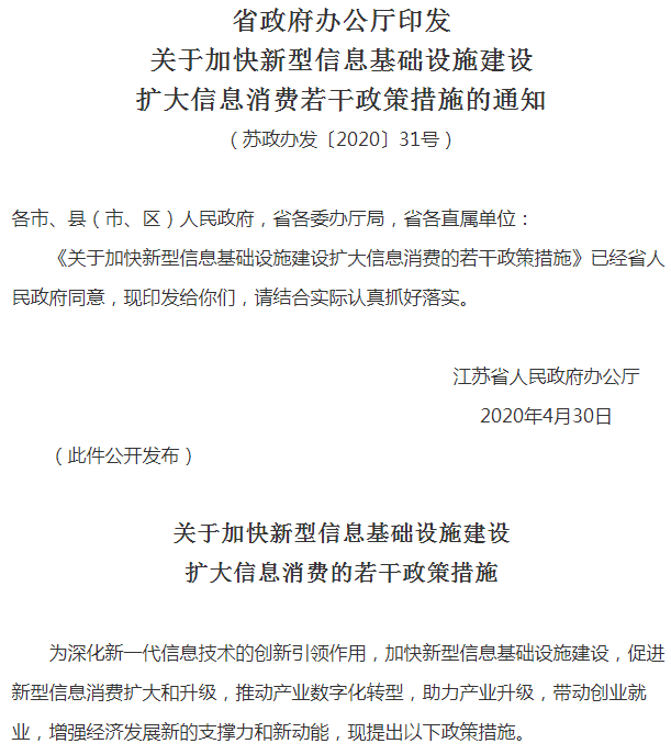 5月11日,江苏省人民政府召开新闻发布会,发布关于加快新型信息基础设施建设扩大信息消费若干政策措施,加快新型信息基础设施建设,促进新型信息消费扩大和升级,推动产业数字化转型,助力产业升级,带动创业就业,增强经济发展新的支撑力和新动能。