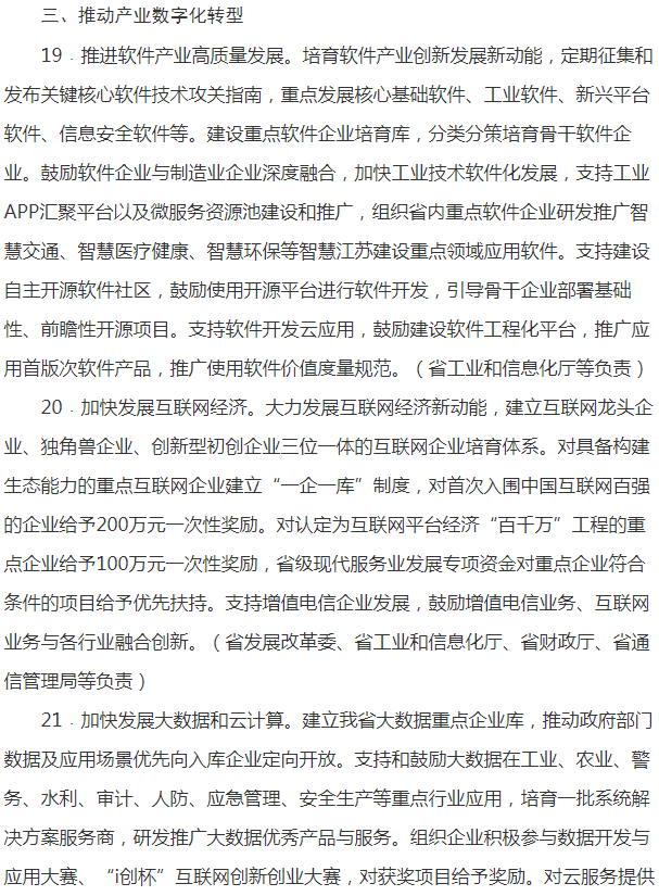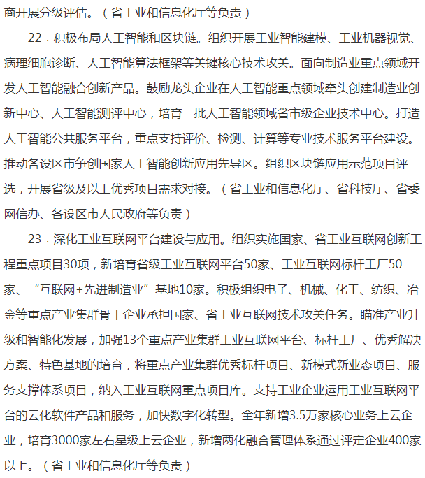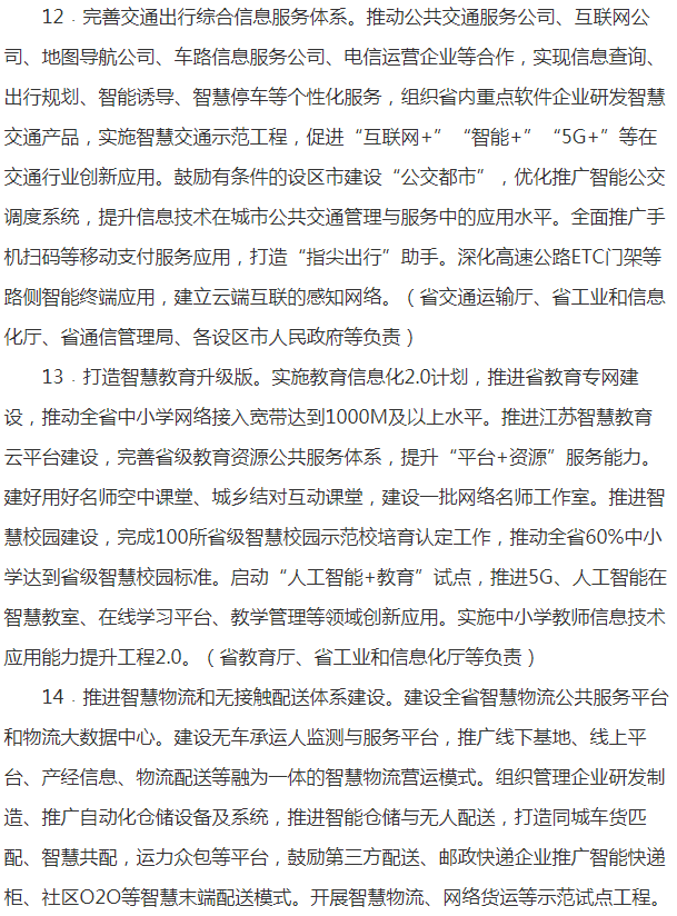 根据《政策措施》,江苏将发挥在5G、工业互联网等建设方面的领先优势,加强与龙头骨干企业的战略合作,全面加速发力、扩大投资强度,加快建设以5G、物联网、工业互联网为代表的通信网络基础设施,以人工智能、云计算、区块链等为代表的新技术基础设施,以数据中心、智能计算中心为代表的算力基础设施,和以智能交通设施、智慧能源基础设施等为代表的融合基础设施,既发挥即期效应,又培育持久动能。