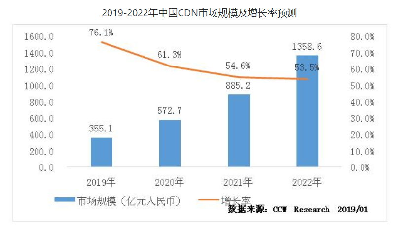 根据计世资讯(CCW Research)研究显示,2019年以后,随着企业数字化转型和各产业信息化工程的深入建设,以互联网、政府、金融等行业等为代表的用户开始进入提质增效、业务拓展的关键阶段,同时,随着5G等新兴通讯技术的应用,我国网络建设也将进入一个新的阶段,人工智能、物联网应用规模和深度将不断增加,用户对网络体验的需求也将持续增强,对CDN技术的需求也会提升一个层级,2019-2022年期间CDN市场将保持高速增长,预计2019年中国CDN市场规模将达到355.1亿元,而随着新兴信息技术的不断演进,CDN将与云安全、人工智能、边缘计算、物联网、视频云、大数据等解决方案进一步融合,CDN将成为支撑这些技术落地应用的重要网络平台,使得CDN市场的内涵和外延不断扩大,拉动市场规模迅速扩充,预计到2022年,市场规模将达到1358.6亿。