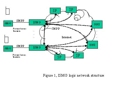 As shown in Figure 1, ISMG is a medium entity between an external information resource station entity (SP) and the SMSC within the mobile network. On one hand, ISMG is required to receive messages sent by SP to mobile users, and submit them to SMSC. On the other hand, messages of mobile users ordering SP services will be sent by SMSC to SP via ISMG. In addition, to reduce the signaling load of SMSC, ISMG shall also forward messages submitted by SP to the corresponding ISMG according to the route principles. ISMG makes a query to the tandem gateway (GNS), and by doing so gets the forwarding route messages between gateways.