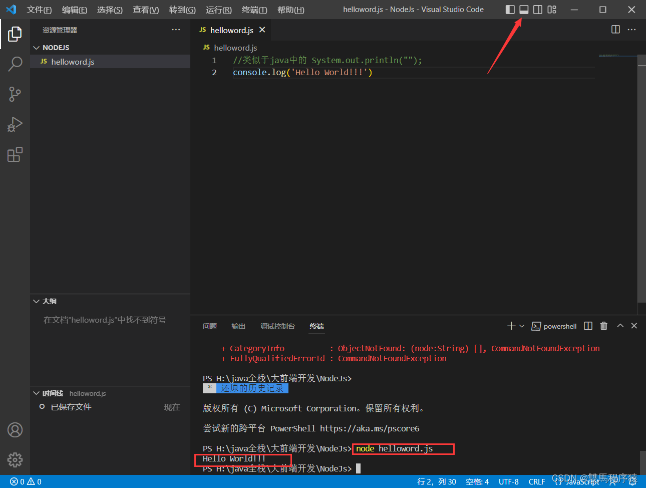 在终端(Ctrl+`)运行:node helloworld.js