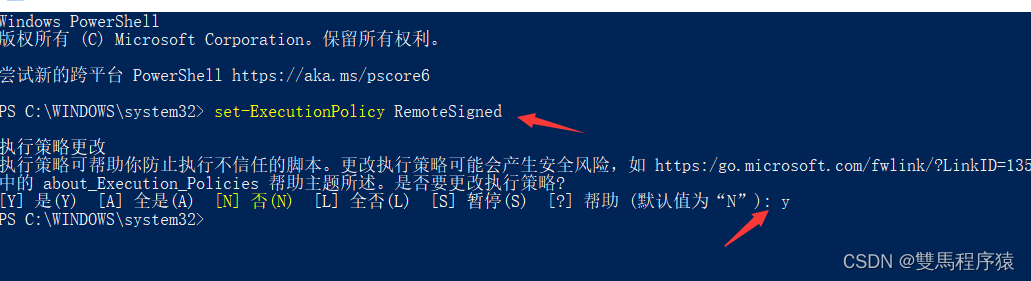 在窗口中输入set-ExecutionPolicy RemoteSigned,然后在输入y