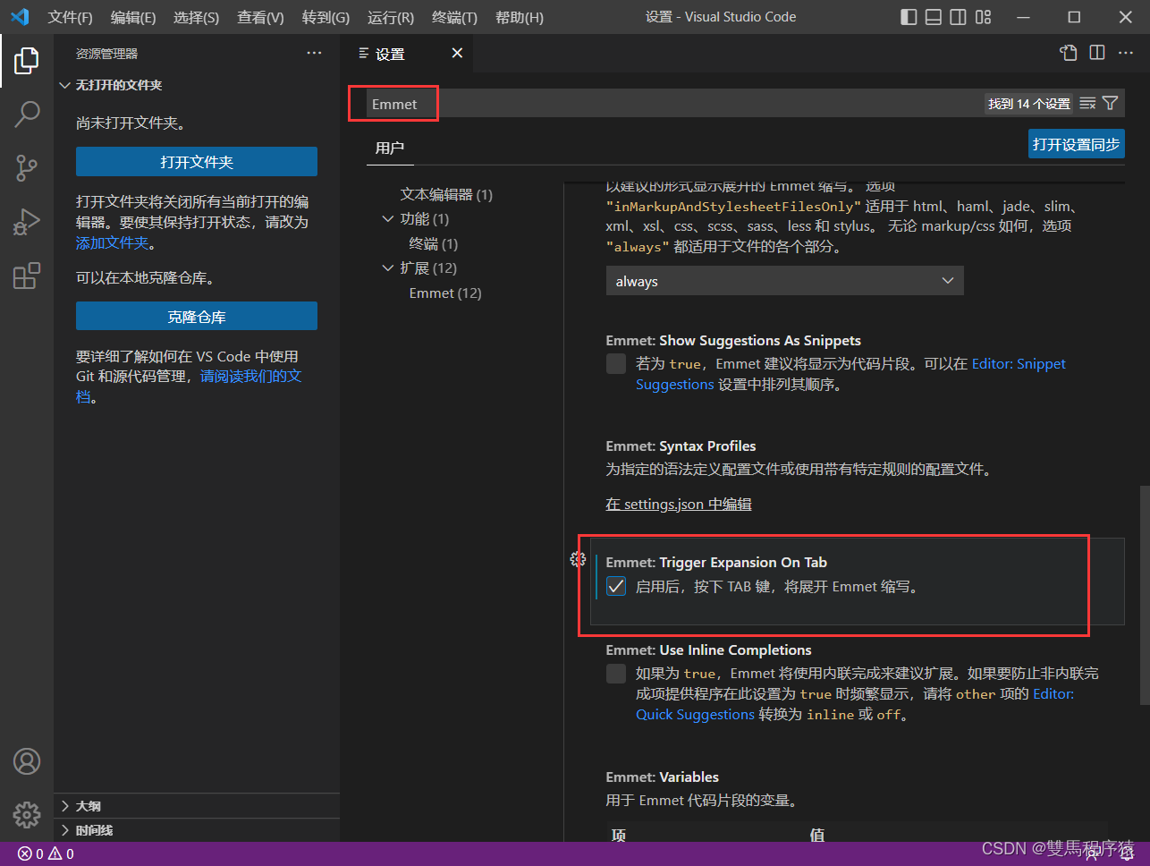 设置中搜索 Emmet:启用如下选项,必要时重启vs(按住Tab可以自动补全)