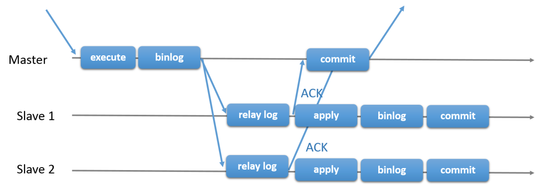 另外,基于异步复制的基础上进行改进的半同步复制,它为主从复制协议添加了一个同步的步骤(指的是主库同步binlog到从库的步骤,并不包括重新执行或应用的步骤)。这意味着主库在提交事务时需要等待从库确认它已经收到该事务的binlog(从库收到binlog之后,会返回一个ACK包给主库,主库通过这个ACK包来确认从库是否有收到事务的binlog)。只有这样,主库才会将事务进行提交(这里指的是存储引擎层的提交,而非客户端发起事务提交的语句),半同步复制的流程图如下。