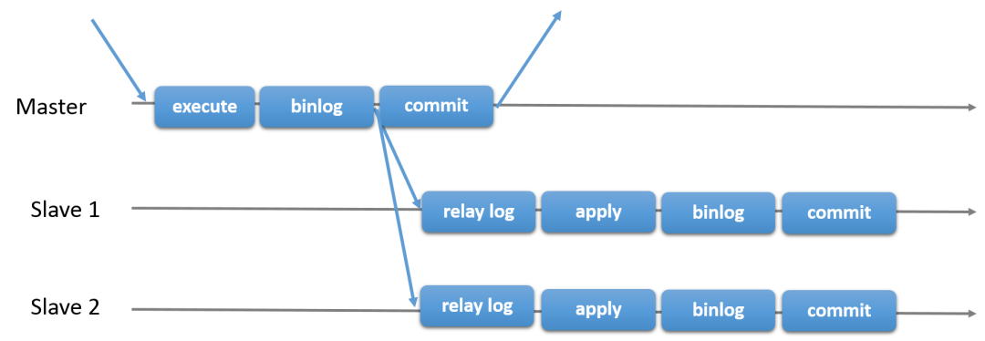 传统的MySQL复制提供了一种简单的主从复制方法。其复制拓扑中,由一个主库加上一个或多个从库组成。在主库中执行数据更新的事务,并提交事务。将数据变更记录到主库的binlog文件中,稍后(因此称为异步)将这些binlog发送到从库中,以便在从库中重新执行数据变更语句(基于statement的复制中)或应用数据变更的row格式日志(在基于row格式的复制中)。它是一个shared-nothing的系统,默认情况下,所有的MySQL Server都拥有完整的一份数据副本。异步复制的流程图如下。