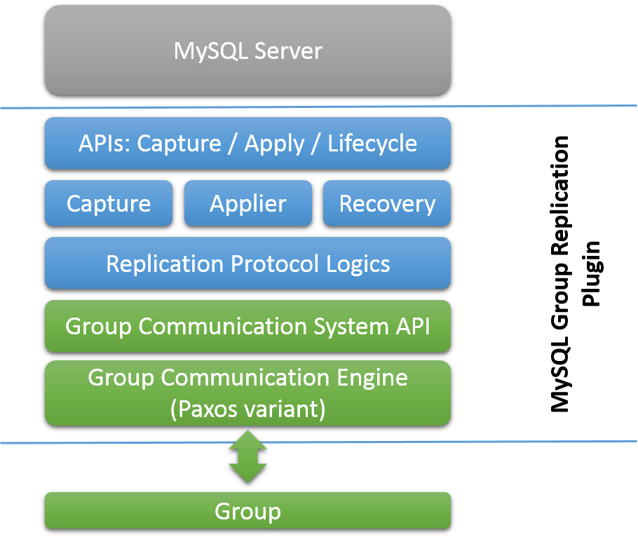 以上提到的所有这些特性,都是由组通信系统(GCS)协议提供支持的。它们提供了故障检测机制、组成员服务以及安全且完全有序的消息传递。所有这些属性对于创建一个可确保跨组成员且能够一致地复制数据的系统中非常关键。该技术的核心是Paxos算法的实现。它充当着组通信引擎的角色。