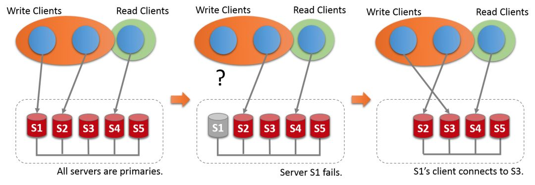 如果一个Server加入了组,则它会从组的现有成员中自动获取自身缺失的数据状态以便和组保持数据同步。如果一个组成员脱离了组,例如:例行维护时关闭了某个组成员,其余的组成员会发现该成员脱离了组,并自动重新配置组。