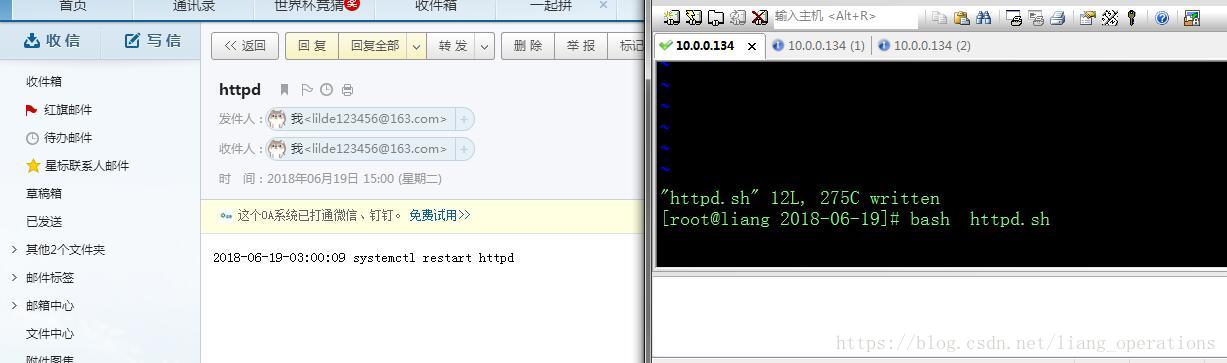 | [root@liang 2018-06-19]# cat httpd.sh #!/bin/bash Mail=lilde123456@163.com while true do Num=`netstat -lntup|grep -w "80"|wc -l` if [ "$Num" -eq 0 ];then /usr/bin/systemctl restart httpd > /dev/null 2>&1 Date=`date +%F-%T` echo "${Date} systemctl restart httpd"|mail -s "httpd" ${M ail} fi sleep 30 done |