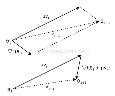 相对标准的Momentum法,梯度的计算从在更新v之前变成了更新v之后。如下图,它会先计算 w'(t+1) = w(t) + µ v(t) , 然后计算 v(t+1) = µ v(t) - ε Δw‘(t+1) , 最后更新 w(t+1) = w(t) + v(t+1) 。