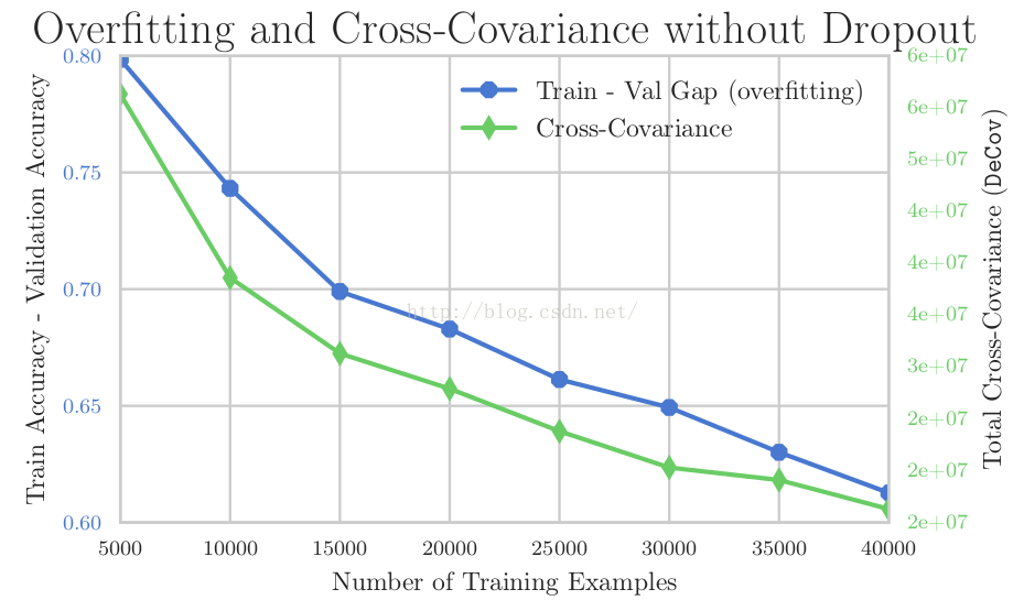 提高CNN的方法其中重要的一点是scale,具体方法包括batch normalization, Adaptive SGD , ReLu, 从而获得更佳的收敛性能。另外,防止overfitting(过拟合)也是非常重要的一个课题。有研究者挖掘出了训练数据量、训练测试差别、互协方差之间的关系,如下图