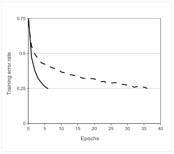 图1:使用ReLU的四层卷积神经网络在CIFAR-10数据集上达到25%的训练误差比使用tanh神经元的等价网络(虚线)快六倍。为了使训练尽可能快,每个网络的学习率是单独选择的。没有采用任何类型的正则化。影响的大小随着网络结构的变化而变化,这一点已得到证实,但使用ReLU的网络都比等价的饱和神经元快几倍。
