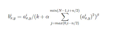 ReLU具有让人满意的特性,它不需要通过输入归一化来防止饱和。如果至少一些训练样本对ReLU产生了正输入,那么那个神经元上将发生学习。然而,我们仍然发现接下来的局部响应归一化有助于泛化。aix,yax,yi表示神经元激活,通过在(x,y)(x,y)位置应用核ii,然后应用ReLU非线性来计算,响应归一化激活bix,ybx,yi通过下式给定: