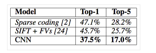 表1:ILSVRC-2010测试集上的结果对比。斜体是其它人取得的最好结果。
