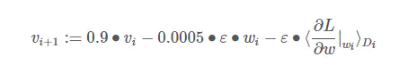 i是迭代索引,v是动量变量,ε是学习率,〈∂L/∂w|wi〉Di〈∂L/∂w|wi〉Di是目标函数对w,在wi上的第i批微分Di的平均。