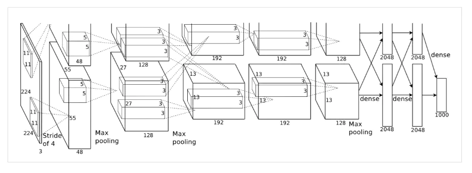 第1卷积层使用96个核对224 × 224 × 3的输入图像进行滤波,核大小为11 × 11 × 3,步长是4个像素(核映射中相邻神经元感受野中心之间的距离)。第2卷积层使用用第1卷积层的输出(响应归一化和池化)作为输入,并使用256个核进行滤波,核大小为5 × 5 × 48。第3,4,5卷积层互相连接,中间没有接入池化层或归一化层。第3卷积层有384个核,核大小为3 × 3 × 256,与第2卷积层的输出(归一化的,池化的)相连。第4卷积层有384个核,核大小为3 × 3 × 192,第5卷积层有256个核,核大小为3 × 3 × 192。每个全连接层有4096个神经元。