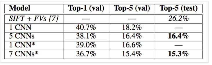 表2:ILSVRC-2012验证集和测试集的误差对比。斜线部分是其它人取得的最好的结果。带星号的是“预训练的”对ImageNet 2011秋季数据集进行分类的模型。更多细节请看第六节。