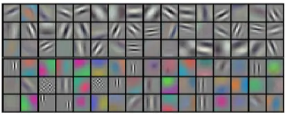 图3:第一卷积层在224×224×3的输入图像上学习到的大小为11×11×3的96个卷积核。上面的48个核是在GPU 1上学习到的而下面的48个卷积核是在GPU 2上学习到的。更多细节请看6.1小节。