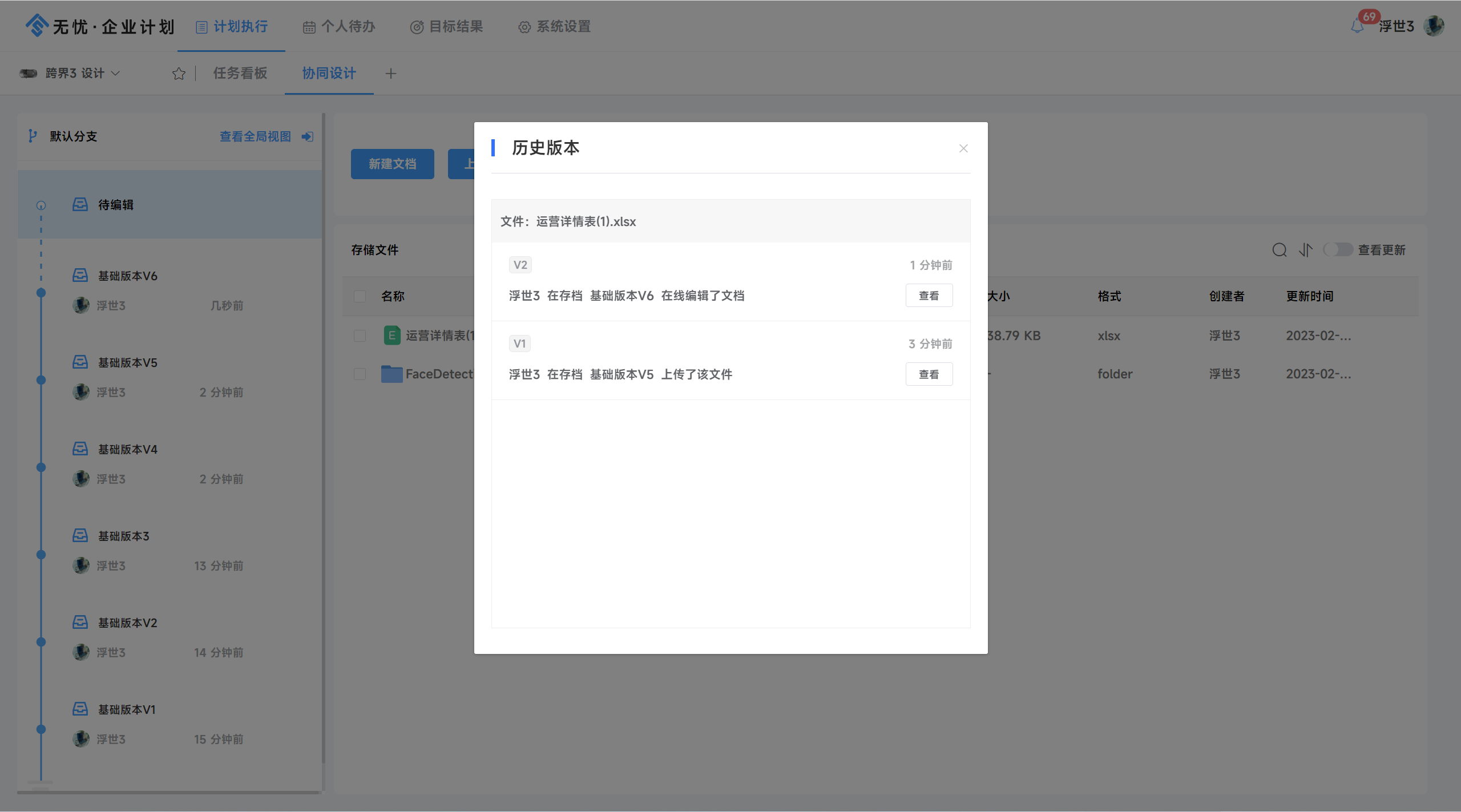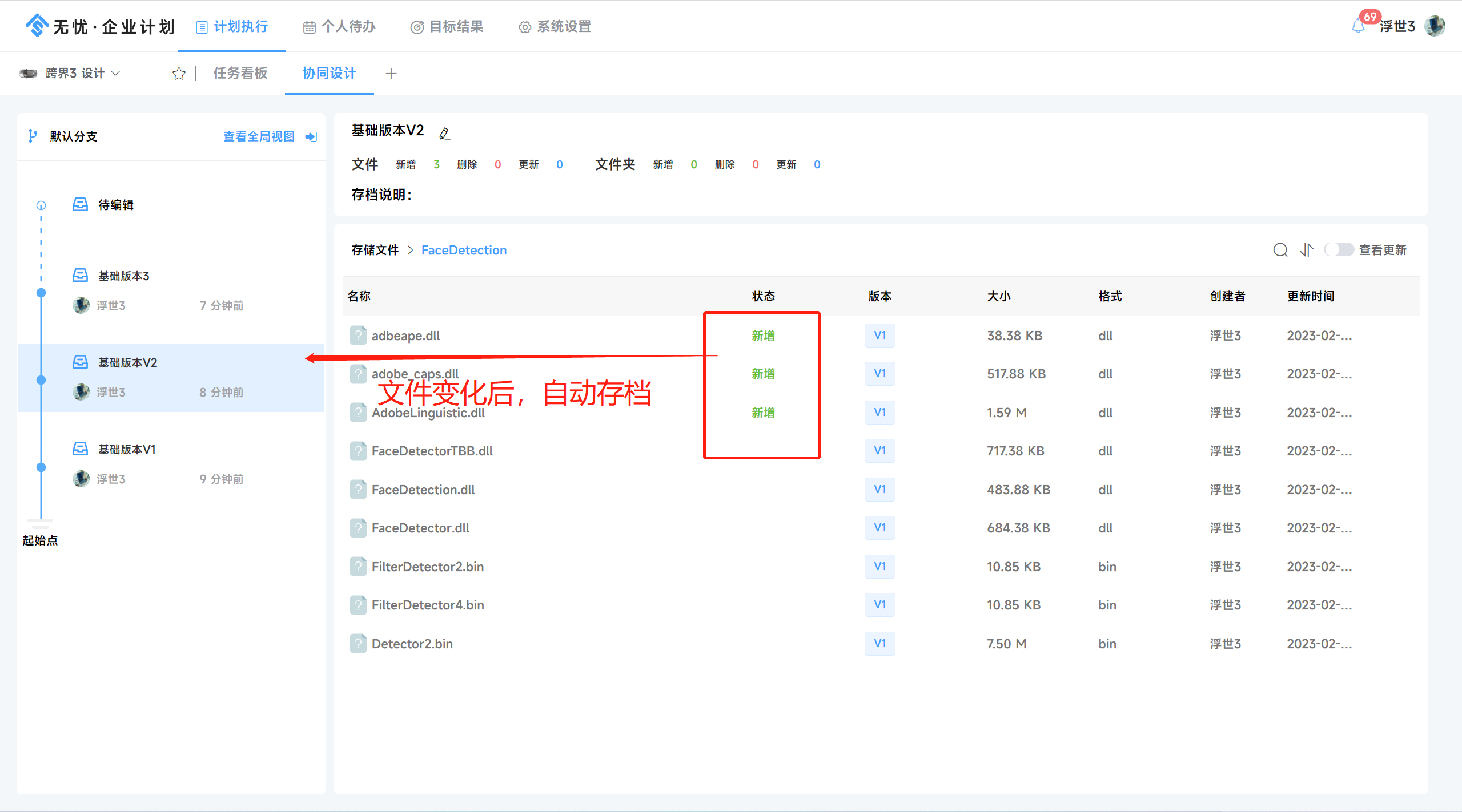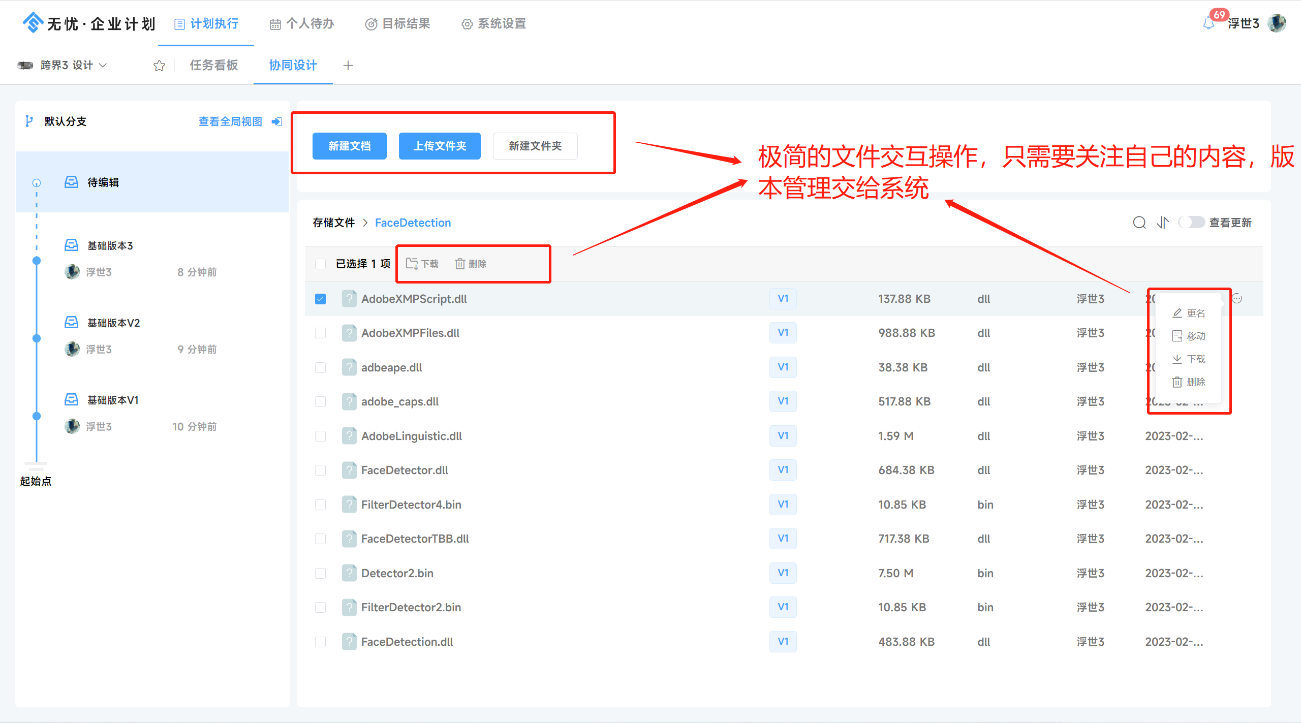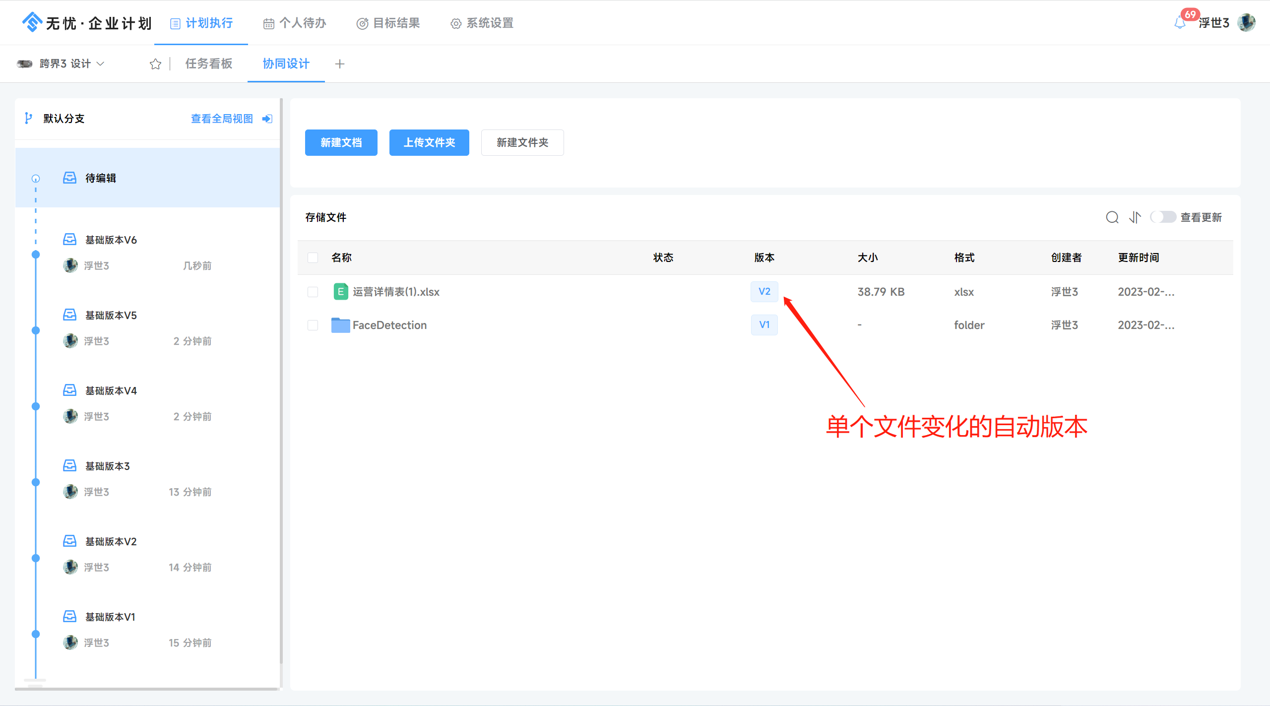 单个文件编辑或者改动上传后,系统会对该文件自动记录对应的变化,并自动记录文件的版本