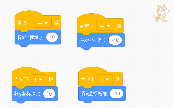 - 当按下键盘上某个具体的键时,执行后面的程序指令,下拉三角可以选择“方向键”,“字母键”,“数字键”等。