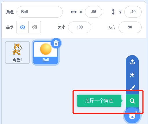 在角色区,点击“选择一个角色”菜单,在角色库中选择“Ball”。