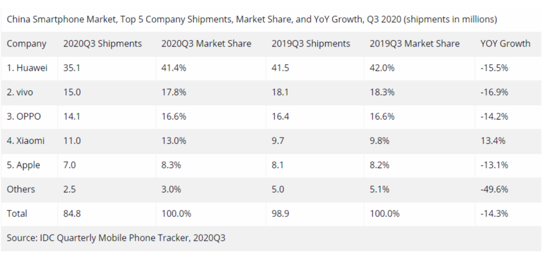 财报中并未提及具体出货量。对此,IDC数据显示,华为三季度以3510万台稳居第一,市场份额41.4%,位列第四的小米出货量1100万台,市场份额13%,是TOP5厂商中唯一增长的品牌,同比增长13.4%。照此计算,小米手机国内出货量的贡献度只有23.6%。