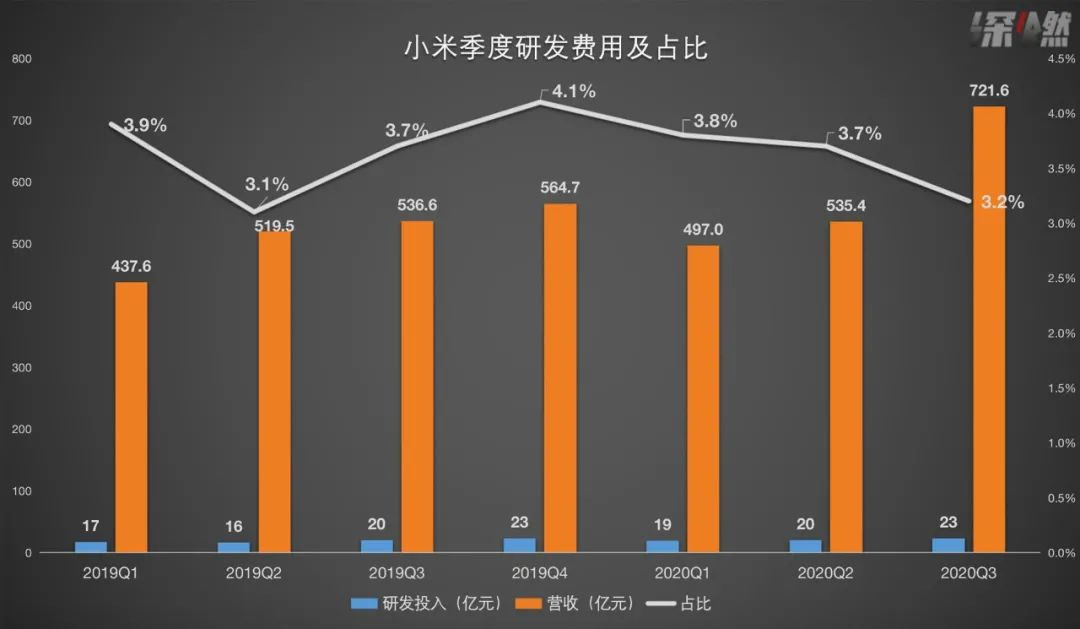 高端之路并非一蹴而就,但小米似乎并未在研发投入上发力。本季度研发投入23亿元,占总收入3.2%,比去年同期的3.7%还要低。实际上,过去两年里,小米在研发投入上一向谨慎,至少在过去八个季度,研发投入在总营收中的占比始终控制在3%-4%之间。