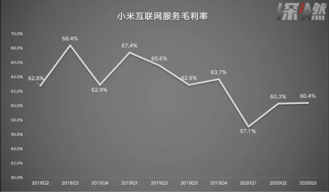 财报显示,小米的整体毛利率由2019年第三季度的15.3%降至2020年第三季度的14.1%,IoT和互联网的毛利率一增一降,分别由12.8%涨到14.2%,由62.9%降至60.4%。对于后者,小米解释,是金融科技及游戏业务毛利率下降所致。